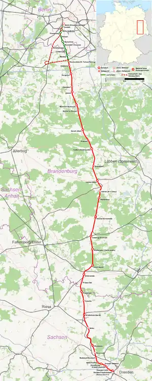 The Berlin–Dresden railway is a double track, electrified main line railway in the German states of Berlin, Brandenburg and Saxony, which was originally built and operated by the Berlin-Dresden Railway Company (Berlin-Dresdener Eisenbahn-Gesellschaft). It runs from Berlin through the southern Teltow countryside and then between Lower Lusatia and Fläming Heath through Elsterwerda and the Großenhainer Pflege countryside to Dresden.