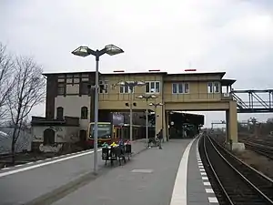 Service was only restored on the Ringbahn after German reunification, although the Berlin Senate had been working on plans to reopen it even before the Wall fell, since the S-Bahn had been transferred in January 1984 to the BVG (Berlin Transport).[3] Südring was again appended to the name of the Tempelhof U-Bahn station on 31 May 1992,[2] and the S-Bahn station reopened on 17 December 1993 when the segment of the South Ring between Baumschulenweg and Westend was placed back in service, and thus the station is once more a transfer point between the S-Bahn and the U-Bahn.