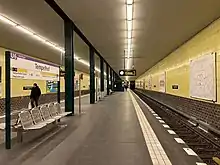 After the erection of the Berlin Wall in 1961, West Berliners boycotted the S-Bahn to put pressure on the GDR government, which controlled the parent Deutsche Reichsbahn. The boycott led to extremely reduced S-Bahn passenger numbers, and after a strike by West Berlin S-Bahn employees to the ending of service over large stretches of the system in the West. The West Berlin portion of the Ringbahn, including the Tempelhof station, was taken out of service in September 1980.[3] The U-Bahn station, named simply Tempelhof since 1962, remained in service.[2] It was renovated in 1985; the ceiling had sustained bad water damage and was plastered over. The brightly coloured rectangular patterns on the ceiling date to this time.[4]