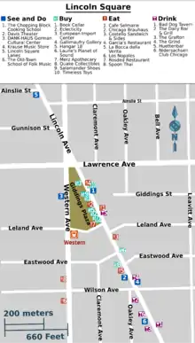 This is a tourism map of Lincoln Square. Lincoln Square is a neighborhood in the northern part of Chicago. It has been a historically German neighborhood.