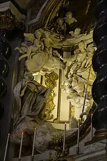 Sculpture of Saint Augustine and the Virgin Mary in the church of the Madonna della Consolazione in Genoa, Italy.
