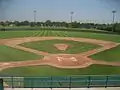 Bernie Arbour Stadium dimensions are 300 feet down the left field line, 325 down right field, 365 to left-center, 405 to straight-away center and 365 to the power alley in right-center. The main grandstand accommodates upwards of 300 spectators and another 1,000 + spectators can be seated in the first and third base bleachers. The Press Box, seats up to 10 members of the media and is capable of supporting radio and television broadcasts.[1]