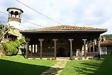 The three gates of the church face the town, the river and the pine forest. A large porch dominates the convent yard and in the dimness of its interior oil lamps lighten images of saints, painted in a characteristic style that is antonymic to Byzantine canons. Only one icon, that of Noah, painted by George Veljanov from Strumica in 1818. From 1897 to 1920 the painter Gavril Atanasov also worked in the convent. The icon of the Dormition of the Theotokos was painted by Gregory Pecanov from Strumica in 1878. The residential quarters are of a free-style construction. They attract with the warmth of the wood used, shaped in a 19th-century old-urban style.