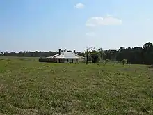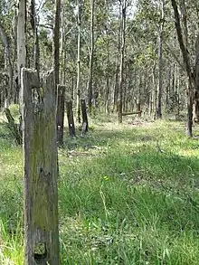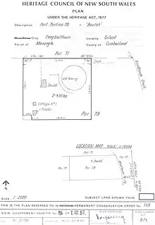 Scott put the property up for auction in Sydney in June 1845. The auction notice declared that "Summer Hill Farm" was entirely "stumped and free for the plough from one end to the other". In addition to a cottage (no longer a 'handsome homestead'!) with dining and drawing rooms, four verandah rooms, detached kitchen and laundry, the improvements included a 'moderate sized barn, men's huts, stables' and "a large tank".[68] The reference to a large tank in this context is a reference to a dam, probably intended to hold water for livestock (The 1833 edition of the New South Wales Calendar and General Post Office Directory notes that Thomas Rose who then owned Mount Gilead, the property to the north of Summer Hill, had been 'the first to construct a tank sufficiently capacious to secure him from the want of water in dry seasons'). Summer Hill was offered as a property that was "desirable as either a country residence for any party desirous of living away from the city, yet within a comfortable drive of it, or, as a dairy or agricultural farm". Interestingly, although offered as 49 hectares (120 acres), it was described as actually being 53 hectares (132 acres) - the discrepancy explained by the creek "having been roughly surveyed as a straight line".[1]
