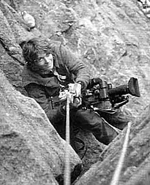 ![]() Johnson with a video camera, roped to a rockface (Mike Hoover) | |