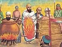 ![]() 20th century painting of the martyrdom of Bhai Mati Das (right), Bhai Sati Das (middle), and Bhai Dayala (left) | |