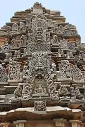 The outer wall of the temple has projections and recesses creating niches. In these niches are miniature decorative towers in relief (called aedicula or turrets), the execution of which evolved during the Later Chalukya rule. The vesara style aedicula are supported by double pilasters while the dravida (south Indian) style aedicula are supported by single pilasters. The art historian Percy Brown calls the Later Chalukyan style of wall decoration "exceptionally well rendered", and according to Kamath, the miniature towers are wrought in a "most artistic refrain".[5] Each tier of the superstructure has a kirtimukha (gargoyle like face). Below each kirtimukha, is a relief of a deity such as the Nataraja or Maheshvara (both forms of the Hindu god Shiva). Worthy of mention is the ornate relief on the lintel and door jamb at the entrance to each sanctum (garbhagriha) which exhibit Saiva dvarapalas ("guardians" to a shrine of the god Shiva) flanked by female umbrella (chauri) bearers. Facing the west sanctum is a small sculpture of Nandi the bull. There are sculptures of various deities from the Hindu pantheon in the niches in the interior wall of the temple, such as Ganesh (elephant headed god of "beginnings" in Hinduism), Mahishasuramardhini (a form of Durga) and the Saptamatrika (the seven Hindu goddesses). The ceiling in the common hall is supported by four polished lathe turned pillars, which according to Kamath is also a characteristic feature of Western Chalukya temples.[4]