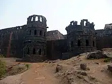 According to R. C. Dhere's interpretation of local oral history and ethnography, Bhonsles descend from the Hoysalas and Yadavas of Devagiri, who were cow-herding Gavli sovereigns.[15][lower-alpha 3][lower-alpha 4] In early thirteenth century, "Baliyeppa Gopati Sirsat", a Hoysala cousin of Simhana migrated from Gadag to Satara along with his pastoral herd and kul-devta; the Sambhu Mahadev was thus installed at a hill-top in Singhnapur.[15][lower-alpha 5][lower-alpha 6] Historical records indicate that this shrine received extensive patronage from Maloji onwards.[15][lower-alpha 7] Further, there exists a branch of the Bhosles named "Sirsat Bhosles" and Bhosle (or "Bhosale") is linguistically similar to "Hoysala".[15] M. K. Dhavalikar found the work to convincingly explain the foundation of the Bhosle clan (as well as Sambhu Mahadev cult).[18] Vajpeyi too advocates that Dhere's theory be probed in greater detail — "[f]rom pastoralist big men to warlords on horseback, is not an impossible distance to cover in two to three centuries."[15]