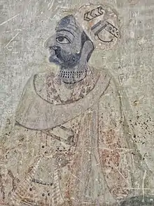 ![]() Detail of a fresco at sadāśiva chuk courtyard in the royal palace. This fresco along with all the other in the courtyard has been heavily vandalized.[1] It depicts Bhupatindra Malla between 1700-22. | |||||