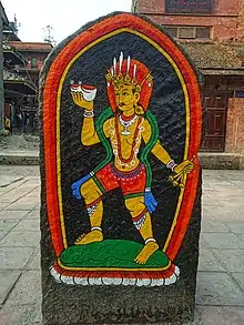 Vira Vétāla (Nepal Bhasa: 𑐰𑐷𑐬 𑐰𑐾𑐟𑐵𑐮), also commonly called Vétadyah (Nepal Bhasa: 𑐰𑐾𑐟 𑐡𑑂𑐫𑑅) is considered the vahana of Bhairava in Bhaktapur and is a popular deity in Bhaktapur. Although he is depicted with a moustache, Vétāla is believed to be a mischievous child.[110] Vétāla is worshipped as the protector of Bhaktapur and of Bhairava.[110] A statue of Vétāla is installed in front of the chariot of Biska Jatra. He is also believed to appear frequently in locales around the Nyatapola temple as a child during the time of the Biska Jatra festival.[110] A folklore prevalent in Bhaktapur tell the tale of a worker who attended the construction of the Nyatapola temple daily, did no work but ate the most lunch.[111] When the other workers noticed him, they quickly reported to Bhupatindra Malla but the king consoled the workers by saying that "he will be of some use, some day".[111] Eventually, when the time came to install the heavy golden pinnacle on the top of the temple, the same worker who did no work before, quickly grabbed the heavy pinnacle and installed it on the top with ease.[111] The man is then said to have disappeared and was never seen again. So, he was believed to be Vétāla himself.[111][110]