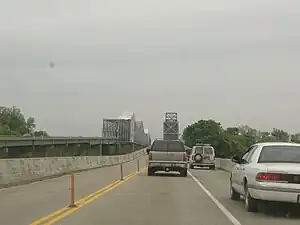 On the northbound bridge; the bridge to the left is the newer southbound bridge, undergoing the 2007–08 renovation. The northbound bridge was reconfigured for two northbound lanes and one southbound lane, leaving one southbound lane on the southbound bridge.