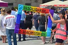 Thousands took to the streets in Warsaw to protest the violence in Białystok.[2] A demonstration for tolerance was held in Gdańsk[14] on 23 July 2019, with the slogan "zone free of zones" (Polish: Strefa wolna od stref).[15][16][17] In Szczecin a demonstration under the slogan of "hate-free zone" (Polish: Strefa wolna od nienawiści) took place,[17][18] and in Łódź left-wing politicians handed out "hate-free zone" stickers.[17][19] A week after the events, left-wing parties held a protest in Białystok against the violence at the march.[4] In the July 2019 Berlin Pride, marchers organized by Die Linke carried signs in solidarity with Białystok. One marcher carried a banner of the Rainbow Madonna, in solidarity with Elżbieta Podleśna who was arrested in May 2019 for putting up signs of the Madonna.[13][20]
