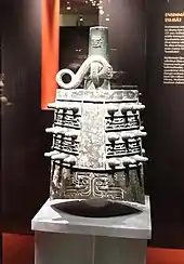 Among the most important sets of bianzhong discovered are a complete ceremonial set of 65 zhong bells, found in a near-perfect state of preservation during the excavation of the tomb of Marquis Yi, who died ca. 430 BCE.[9] Yi was the ruler of Zeng, one of the minor states under control of the major State of Chu. This region is now part of the present-day Hubei province. The instrument is currently on display at the Hubei Provincial Museum in Wuhan, China. It under protection by the government as an esteemed cultural relic, and has been performed on three times since its excavation in 1978, the most recent being for the Hong Kong Reunification ceremony in 1997.[10]