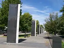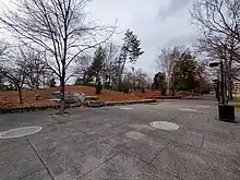 The eastern outer path is the Walkway of Counties, which represents the state's geography from east to west. Throughout the walkway are time capsules from each county, arranged from north to south by Grand Division, which will be opened on the state's tricentennial on June 1, 2096. The lids of each capsule contain brief descriptions of their respective county. The planters next to the walkway highlight the state's diverse topographical landforms, and feature flora from across the state's respective regions.[9] Accompanying these are granite obelisks which provide descriptions of the state's nine physiographic regions. An obelisk detailing the history of the Tennessee State Capitol is also located along here.[6]