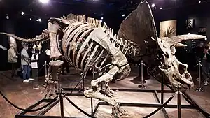 The remains of Big John were purchased for €150,000[10] and assembled over eight or nine months by the Zoic workshop in Trieste, Italy, who had previously restored two Triceratops skeletons.[6][11] More than 200 bones were pieced together.[1] The assembly process began in January 2021[12] and was live-streamed on the company's social media channels.[13] Zoic modelled the dinosaur's posture after the Charging Bull bronze sculpture on Wall Street.[14][15] They originally considered assembling the skeleton to stand on only two legs, but this was not possible given the weight of its skull.[10] Flavio Bacchia, who supervised the assembly, estimated that the Triceratops was about 60 years old and weighed six tons at the time of its death.[5][upper-alpha 1]
