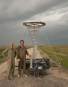 Bigert & Bergström, in front of the tornado diverter, still shot from the shooting of the Weather War, 2012