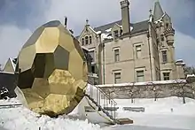 Solar Egg, a fully functioning egg-shaped sauna, was commissioned by Riksbyggen and placed in Kiruna, northern Sweden. The work, while conceptually reflecting on the ongoing geographical re-positioning of the city of Kiruna, was also imagined to be a platform for discussion. A place for reflection and contemplation on the most burning social and environmental issues of nowadays.[12]