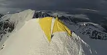 Bigert & Bergström's geoengineering performance was an attempt, a futile symbolic gesture to counteract the glacier melting of Kebnekaise, the highest mountain in Sweden, which gradually losing its elevation. In 2015 during the summer solstice, the mountain's southern peak was covered with a five-hundred-square-meter golden climate-shade cloth, to preserve the glacier. The performance documentation and materials collected during the intervention turned into an installation entitled The Freeze.[6]