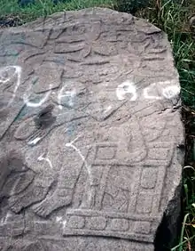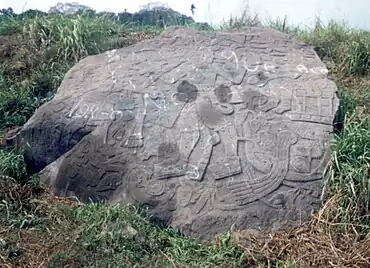 Monument 21 is a basalt boulder in a sugarcane field. The boulder has an artificially flattened upper surface bearing a bas-relief sculpture. The carved face has a 35° slope and measures 11 by 13 feet (3.4 by 4.0 m). The sculpture depicts three main figures. The central figure is the largest and faces towards a second figure seated on a throne. The third figure is behind the central figure, it is smaller and holds a hand puppet. The scene is filled out with twisting vines that sprout cocoa pods bearing human faces. Other details of the monument include birds, snakes and a butterfly with a human head. Monument 21 has been dated to the Classic period.[5] Monument 21 is located east of Mound 2, in the centre of Group B.[35] The decoration on the skirt of one of the figures may be the face of the central Mexican deity Xipe Totec.[13]