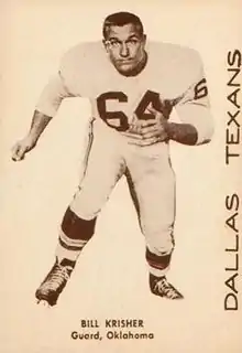 William Irwin Krisher (born September 18, 1935) is an American former professional football player who was a guard in the National Football League (NFL) and American Football League (AFL). He played college football for the Oklahoma Sooners, earning All-American honors in 1956 and 1957. Krisher played two seasons in the AFL from 1960 to 1961 for the Dallas Texans. He was named All-AFL in 1960 and an AFL Western Division All-Star in 1961.