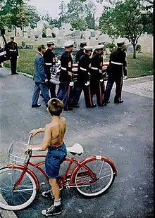 In 1965 Life sent Ray to Asia to cover the war in Vietnam and tensions on the border between Tibet and Sikkim. The cover for August 6 showed the six-inch guns of a light cruiser bombarding Vietcong positions and a photo essay in that issue showed action on an aircraft carrier, including a two-page spread of sailors transferring a 2,000 lb bomb that had been received from a supply ship and another showing crew members from a destroyer checking out a suspicious fishing boat.[3] In October of the same year, Ray was in Sikkim to photograph Chinese Red Army soldiers patrolling the Tibetan border of that Indian province.[17] In 1966 Ray produced a photo essay in a small Ohio town from which a relatively large number of young men had been sent to fight in Vietnam. It included shots of a military funeral for a marine killed in action (shown at right) and photos of six families, standing next to their television sets, each set showing President Lyndon Johnson giving a press conference. In varying degrees they expressed doubts about the war and, as the accompanying text said, "doubted Johnson's optimistic appraisal of Vietnam."[18] Before going to Massillon Ray made a photo essay showing the Watts section of Los Angeles as a follow-up to the previous summer's riots.[19] In 1968 Ray was in Prague taking photographs of the Soviet invasion that brought the Prague Spring to an end.[20] One of the images appeared in a double-page spread in the issue for August 30 (shown at left). The accompanying description said, "Suddenly, unbelievably, Soviet tanks were in the streets of Prague, and the brief idyll of liberation, the brave rebirth of national pride and expectation were at an end... Utterly astounded by the treachery and admonished by their leaders to offer no resistance, the Czech people could only gather with their flags in anguished crowds and hurl threats and a pitiful defiance against the steel of the invaders."[20]