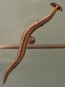 Bipalium is a genus of large predatory land planarians. They are often loosely called "hammerhead worms" or "broadhead planarians" because of the distinctive shape of their head region. Land planarians are unique in that they possess a "creeping sole", a highly ciliated region on the ventral epidermis that helps them to creep over the substrate.[2] Native to Asia, several species are invasive to the United States,[3] Canada, and Europe.[4][5] Some studies have begun the investigation of the evolutionary ecology of these invasive planarians.[6]