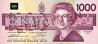 The pink-hued $1000 banknote has an obverse with the same portrait of Elizabeth II used on the $2 banknote adjacent to a vignette of the Centre Block and Library of Parliament, the modern flag of Canada flying from the Peace Tower.[15][27] The reverse features a pair of pine grosbeaks, the engraving of which was based on a watercolour by John Crosby.[27] Originally, it was intended to use an image of a spruce grouse, but its nickname "fool hen" was "considered too controversial".[27] This was the first new $1000 bill printed since the 1954 Canadian Landscape series.
