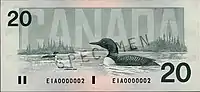 The green $20 banknote has an obverse featuring Elizabeth II, the same engraving used for the $2 banknote,[22] and a reverse featuring two common loons.[11][24] The building vignette adjacent to the portrait is the Library of Parliament.[22] The image of the loons was intended for a $1 banknote, but when it was decided to replace that with the $1 loonie coin, the image was instead used for the $20 banknote.[22]
