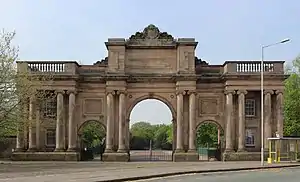 The Grand Entrance is at the northeast entrance to Birkenhead Park. It consists of three arches flanked by lodges and is in Ionic style. The entrance was designed by Lewis Hornblower, with amendments by Joseph Paxton, the designer of the park. The park, and its entrance, were opened in 1847. The Grand Entrance is recorded in the National Heritage List for England as a designated Grade II* listed building.[17]