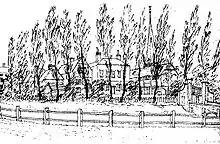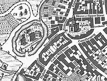 Documentary evidence of the site is slight. The moat may have been associated with the castrum mentioned in the royal charter of 1166 that granted Peter de Birmingham the right to hold a market in Birmingham,[7] though this isn't certain.[8] The site was mentioned again in a survey of Birmingham of c. 1529 that describes the moat and a drawbridge and claims that the buildings were in a ruinous condition.[9] Another sixteenth-century document describes an outer court to the south east of the site.[7] By the time the site was first illustrated in William Westley's 1731 map of Birmingham there appear to have been no medieval buildings remaining apart from a large circular dovecote,[9] and later maps of 1750 and 1778 show four buildings running across the site in a north–south direction.[10] A single illustration of the site survives from 1814, the year before its destruction.[10]