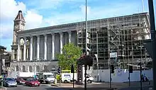 The hall takes the form of a free-standing Corinthian temple, with 14 bays running north to south and 8 bays east to west.[7] It is closely modelled on the Temple of Castor and Pollux in Rome and reproduces its predecessor's most distinctive feature – its tall podium – in rusticated stone.[7] The building's columns are topped with capitals featuring Acanthus leaves in a distinctive interlocking spiral design, above which the simplified entablature features a plain architrave and dentil cornice.[27] Behind the colonnade the cella containing the Great Hall features tall windows capped with eared architraves.[28] At the south end of the podium there is an arcade two bays deep, glazed in to form a vestibule in 1995, that marks the main entrance to the building.[28]