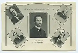 The Lithuanian Literary Society was established in Tilsit in 1879, but it took more academic interest in Lithuanian language and culture. The society considered that the Lithuanian culture was dying due to Germanization and sought to record and study it but took no steps in keeping the language and culture alive.[2] Thus Lithuanian activists began preparations for their own society. The issue was first raised by Georg Sauerwein in Lietuwißka Ceitunga in 1882.[3] The idea was supported and further crystallized by Jonas Basanavičius, Jonas Šliūpas, and others. They decided to establish a society that would study Lithuanian culture and heritage and that would actively promote it among the Lithuanians both in Lithuania Minor and Lithuania Major.[4] They went as far as collecting membership applications and dues and scheduling the organizational meeting for 11 January 1894, but due to various difficulties, including financial hardship faced by Aušra newspaper, such society was not established. Basanavičius established the Lithuanian Scientific Society only in 1907.[4]