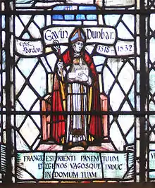 Bishop Gavin Dunbar - holding a "model" of St Mary's hospital ( 1531). From the "Dorcas" window in the Cathedral Church of St Machar, Old Aberdeen. The text "FRANGE ESURIENTI PANEM TUUM ET EGENOS VAGOSQUE INDUC IN DOMUM TUAM" [ ...give thy bread to the hungry and the needy and bring the wandering into your house...] comes from the Foundation Charter. (quote from The Bible (King James) Acts 9:36 & Isaiah 58:7)