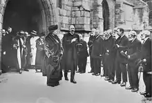 Bedesmen at the Cathedral Church of St Machar, Old Aberdeen in 1922 during the visit of Queen Mary to Aberdeen.