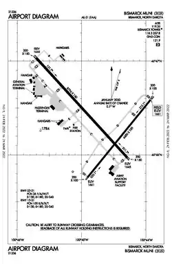 - ↑ "Bismarck Municipal (BIS)". Airport Directory. North Dakota Aeronautics Commission. Retrieved August 13, 2013.