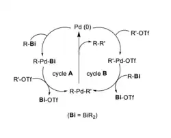 Due to the inert pair effect of the heavy, organometallic compounds of Bi (III) show Lewis acid properties given the lower ability of the 6s electron pair to mix with molecular orbitals and form σ-bonds.[2] The search for non-toxic equivalents of boronic acids in advancing the Suzuki-Miyaura carbon-carbon coupling reactions and expand the scope of carbon-nitrogen and carbon-oxygen coupling ones turned chemists' attention to organometallic bismuch chemistry.[2] Two catalytic mechanisms were proposed in the C-C bond formation catalyzed by bismuth organometallic compounds. The major difference arises from the rate of the oxidative addition to Pd(0) into a C-Bi bond or C-O one, yielding cycles A and B, respectively (see image).