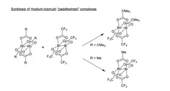 Inspired from the dirhodium tetraacetate bimetallic salt, synthetic chemists decided to explore the synthesis of paddlewheel mixed heteronuclear bismuth-rhodium salts. The synthesis involves treatment of the [Rh2(O2CR)4] salt with the dibusmuth tetrafluoroacetate [Bi2(O2CCF3)4] equivalent.[14][15] Depending on the nature and sterics of the R ligand, the resulting mixed salt has either two tBu R-substituents resulting in the cis mixed salt or a single Me R-substituent provenient from the dirhodium precursor (see scheme to the right). The mixed salts display increased air and moisture compared to the parental dimetallic salts and show Lewis acidity at the rhodium center.[2]