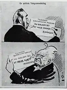 This was in fact a satirical illustration published in Vikingen, but the story got so popular and widespread that Bjørnson had to deny it, claiming that "Michelsen has never asked me to shut up; it would not help if he did".[14]