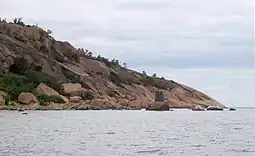 Photo of the original position of the lighthouse at 57°15.014′N 16°48.038′E / 57.250233°N 16.800633°E / 57.250233; 16.800633. The foundation can still be seen at the eastern shoreline of national park Blå Jungfrun.