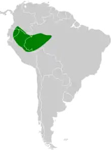 The black-banded crake is found in the western Amazon Basin, from southeastern Colombia south through eastern Ecuador to south-central Peru and east into western Brazil. It inhabits humid landscapes with a dense understory such as secondary forest, where it especially favors overgrown agricultural plots in tropical evergreen forest. It also favors thickets of Heliconia and, on river islands, stands of Cecropia. In elevation it is mostly found below 600 m (2,000 ft) but reaches as high as 1,100 m (3,600 ft) locally in Ecuador.[7]