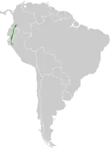 The black-chested fruiteater is native to the Andean region of South America. Its range extends on the eastern side of the Andes from southern Colombia, through Ecuador, to northern Peru; it is found in montane forests and its altitudinal range is 1,500 to 2,300 m (4,900 to 7,500 ft).[2] It also occurs as separate populations locally on the western side of the Andes at Cajamarca and in the south of Marañón Province.[3]