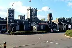 The front corner towers have external entrances with two-centred archways and above them are prominent white flushwork panels, some of which are in the shape of crosses while others mimic arrow slits. A coach house extends from the right-hand corner tower at right angles to the main structure. It has a central two-centre archway front and back with similar small windows on both sides. Above the string course are round flushwork panels and the crenellated parapet is raised above the entrance.[1]
