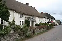 The village is on one of the highest ridges of land between Dartmoor and Exmoor, at an altitude of 656 feet.[1] It enjoys views to both moors, but particularly of Dartmoor from the pub, now closed, the Black Dog Inn, which was a favoured watering hole for walkers on the 'Two Moors Way'. Black Dog is split between the civil parishes of Washford Pyne and Woolfardisworthy.