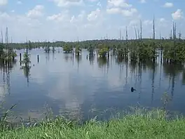 Black Lake is a reservoir located between Creston and Campti in North Louisiana.[1][2] Water feeds into Black Lake from Black Lake Bayou, a watershed that extends from north of Gibsland in Bienville Parish and south to Clarence in Natchitoches Parish[3] through the parishes of Claiborne, Webster, Bienville, Red River and Natchitoches. The elevation of the lake is 102 feet (31 m). Louisiana Highway 9 runs across Black Lake. On the west side of Highway 9 the body of water is called Black Lake — the east is called Clear Lake or Clear Lake Bayou. The Clear Lake side is near another body of water: Saline Lake. Between Clear Lake and Saline Lake is the Alan Chiverly Dam, constructed in 1934. Road 1226 also extends between the lakes.[4] The full area of the lake is 13,500 acres (5,500 ha). Black Lake itself is shallow so in cold temperatures the fish head to Clear Lake and continue on towards Black Bayou as the weather gets colder so that in colder months the fish can be found only in deeper waters. Most of the crappie found at Black Lake are black crappie.[5]