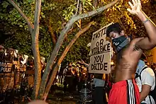 In September, BLM protested the shooting deaths by police officers of Terence Crutcher in Tulsa, Oklahoma, and Keith Lamont Scott in Charlotte, North Carolina.[207][208][209] The Charlotte Observer reported "The protesters began to gather as night fell, hours after the shooting. They held themed signs that said 'Stop Killing Us' and 'Black Lives Matter,' and they chanted 'No justice, no peace.' The scene was sometimes chaotic and tense, with water bottles and stones chucked at police lines, but many protesters called for peace and implored their fellow demonstrators not to act violently."[210] Multiple nights of protests in September and October were held in El Cajon, California, following the killing of Alfred Olango.[211][212]