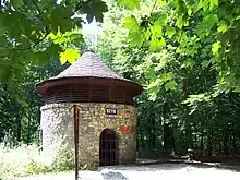 The tourist route was opened in 1957.[1] Due to terrain profile, the route is located 20 to 30 m underground, and is 600 m long.[1] Access is by two shafts with staircases: 30-metre deep "Sylwester" (Sylvester) built in 1828 and 20-metre deep "Ewa" (Eve) built in 1826.[1] Its current name Black Trout Adit came from trouts, that used to penetrate the adit from a river, seeming black in dim lights.[1] Width of the adit varies from 1.2 m to 2.5 m, height to 4 m, water depth from 0.7 m to 1 m.[1] The tourists travel in boat trains, pushed forward by guides.