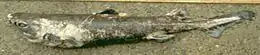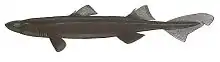 Adult black dogfish typically measure 60–75 cm (24–30 in) in length and can reach 1.1 m (3.6 ft), making it the largest member of its family.[5][9] Females attain a larger ultimate size than males.[8] The shark has a rather stocky and laterally compressed body, with a moderately long, thick, and flattened snout that forms a very broad arch at the front. The sizable, horizontally oval eyes are a reflective green in life and lack nictitating membranes (protective third eyelids); they are followed a short distance behind by much smaller spiracles (accessory respiratory openings). The nostrils are anteriorly placed and preceded by short flaps of skin. The mouth is wide and evenly arched, with thin lips and short but deep furrows around the corners. There are around 34 tooth rows in either side of both jaws; each tooth has three (occasionally up to five) slender cusps, with the central one the longest.[6][9][10]