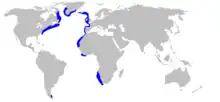 The black dogfish is a common species, with a wide but discontinuous distribution in the temperate waters of the Atlantic Ocean; its range abuts, but does not extend into, the Arctic Ocean. In the northeast, it occurs from Iceland to Sierra Leone, including the Faroe Islands, southern Norway, and the Rockall Trough and Porcupine Seabight off Ireland. In the northwest, it is found from southern Greenland and Baffin Island to Virginia, being particularly abundant in the Laurentian Channel, and may occur further south to the Gulf of Mexico off Alabama. In the southeast, it is found off Namibia and South Africa as far as Cape Agulhas.[1][6] In the southwest, it has been recorded from the Beagle Channel at the southern tip of Argentina.[7]