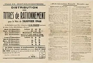 Vichy retained control of economic policy across both zones, subject to the approval of the Germans in the occupied zone.[26] The decree of 30 July 1944 instituted rationing of sugar, pasta, rice, soap and fats. Starting on 23 September 1940, Vichy set up a top-down agricultural supply system as well as an authoritarian distribution of raw materials and industrial products. For consumers this meant food rationing, which they were told would ensure a more even distribution and prevent excessive influence of price on availability.[11] At this point the nascent black market took off.[11]