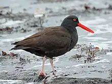 The black oystercatcher is a large shorebird, with a black head, neck and breast and dark brown body, a long (9 cm (3.5 in)) bright red/orange bill and pink legs. It has a bright yellow iris and a red eye-ring. Its plumage varies slightly from north to south, being darker further north.